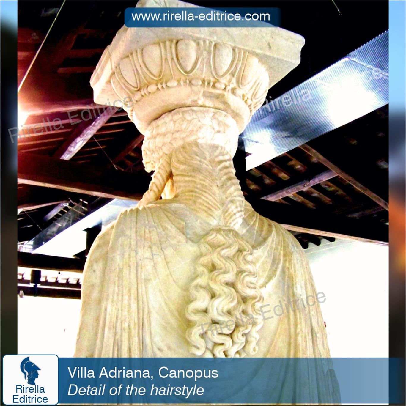 The Caryatids of Villa Adriana have a patera in their right hand, while with the left hand they hold a flap of their dress. The capital above the head and the details of the hair are identical, as is the drapery of the clothes.