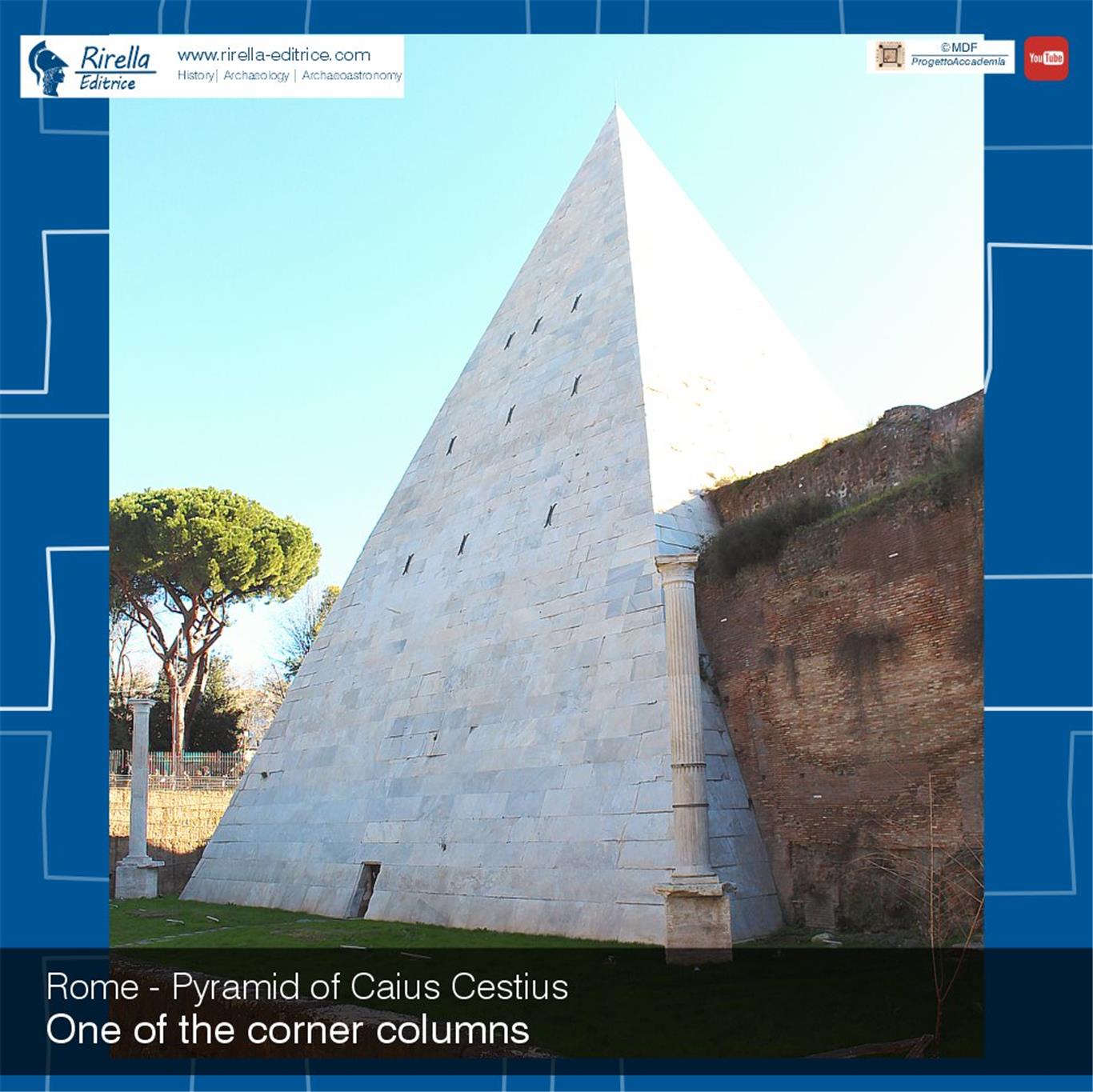 The pyramid had a square base (30 x 30 m i.e. 100 x 100 Roman feet) and is 36 m high. It was built in concrete and masonry and rested on a high base of cement and travertine, currently underground. It had four free standing columns at the corners. The cladding is made with rectangular slabs of white marble from Luni, i.e. Carrara marble.