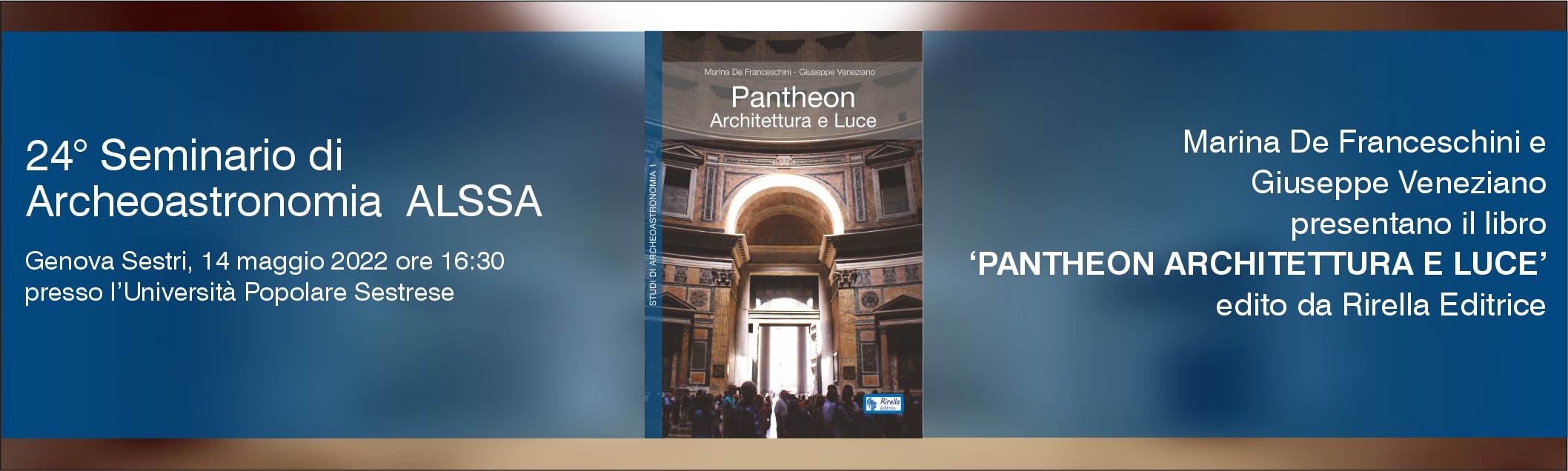 ✅ Il 14 maggio alle ore 16:30 Marina De Franceschini e Giuseppe Veneziano presenteranno il loro ultimo libro "Pantheon. Architettura e Luce", in italiano e in inglese, durante il 24° Seminario di Archeoastronomia.