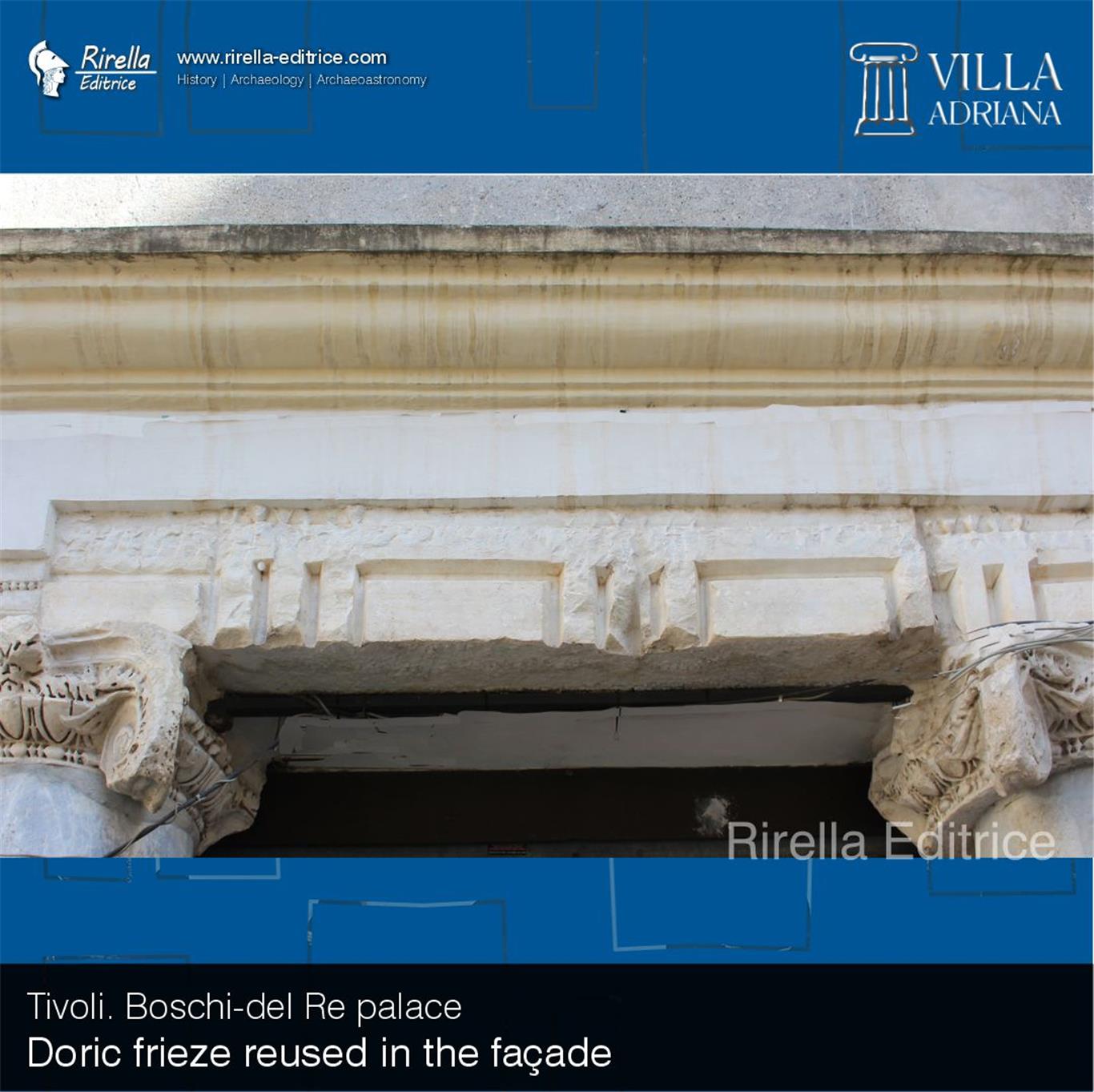 A fragment of a Doric frieze can be seen on the façade of the same building. It too comes from Villa Adriana, from the Hall with Doric Pillars, where there still is a much better preserved section with triglyphs and metopes.