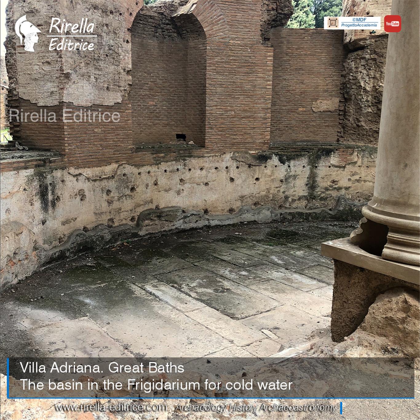 These features are present in the Great Baths of Villa Adriana. First of all, there is a large rectangular Palestra (Gymnasium) paved with herringbone bricks (opus spicatum). Then there is the Frigidarium, with two large cold water pools, once cladded in white marble. On the outside there were several heated rooms, among which the circular «sauna" (Sudatio) covered by a dome stands out.