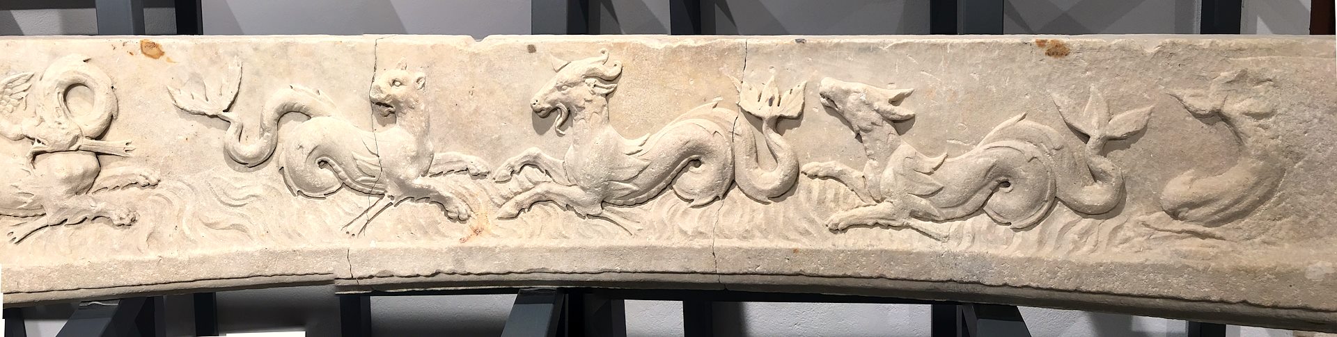 Sono un esempio della straordinaria fantasia e creatività degli scultori che decorarono Villa Adriana. Mostrano creature fantastiche e mostruose, con hanno teste ed ali di animali oppure il corpo di un Tritone o di un Amorino, e tutti terminano con una coda di pesce. Nuotano su un mare di onde appena accennate.